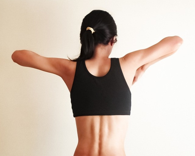 ②上げた時は、肘の位置が肩の高さ程度にします。それ以上に上げると頸がすくむようになり、僧帽筋(頸の横の筋肉)が働きます。