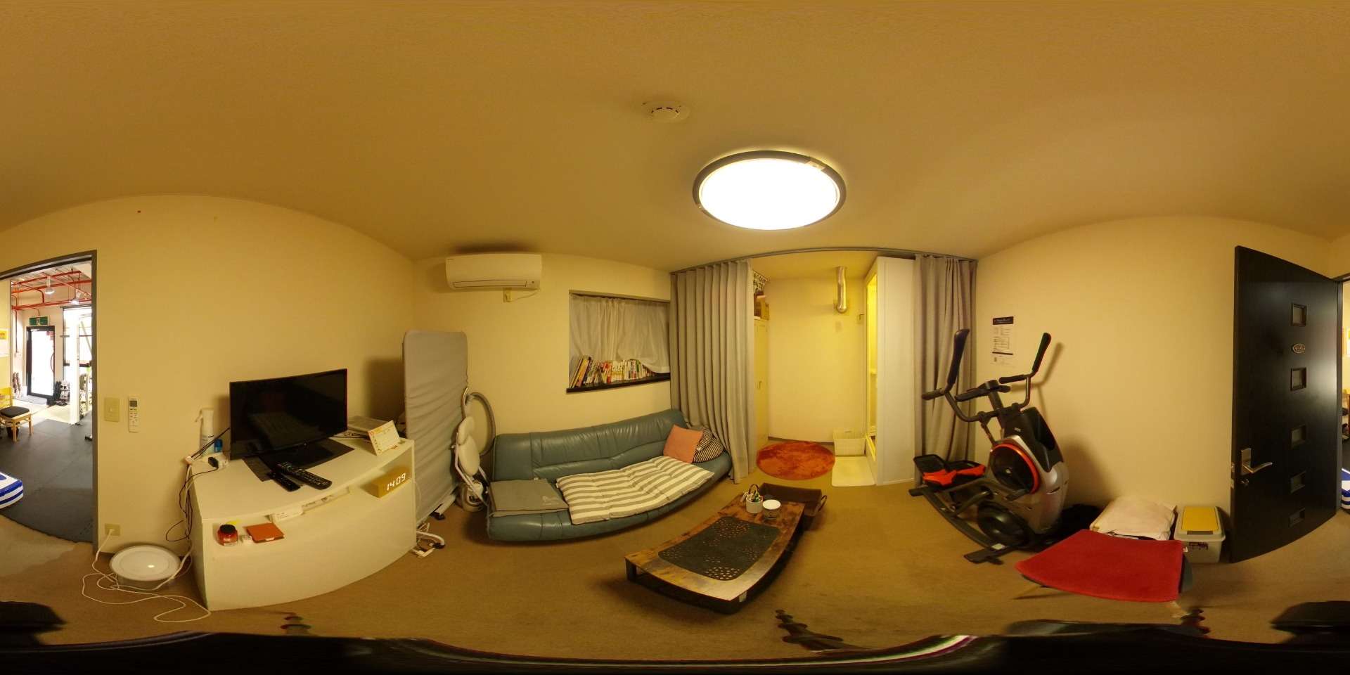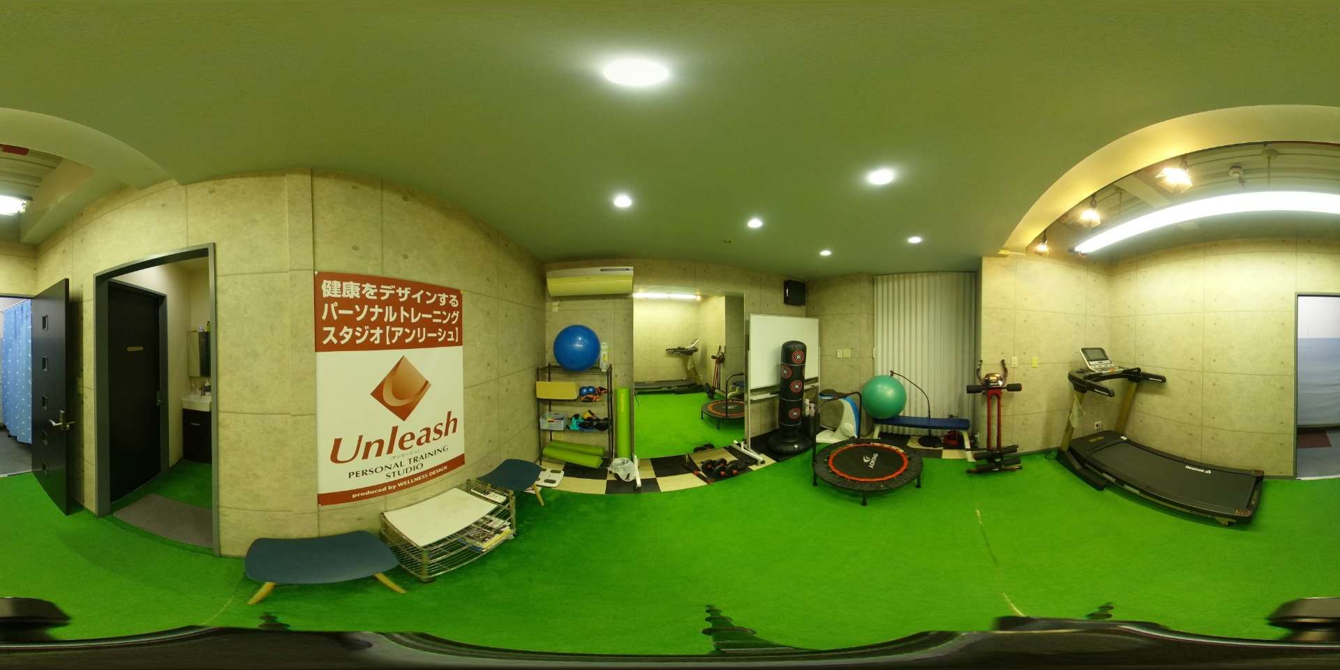 人口芝フロアに、鏡、マット、トレッドミルなど有酸素運動マシン1台などが設置されています。