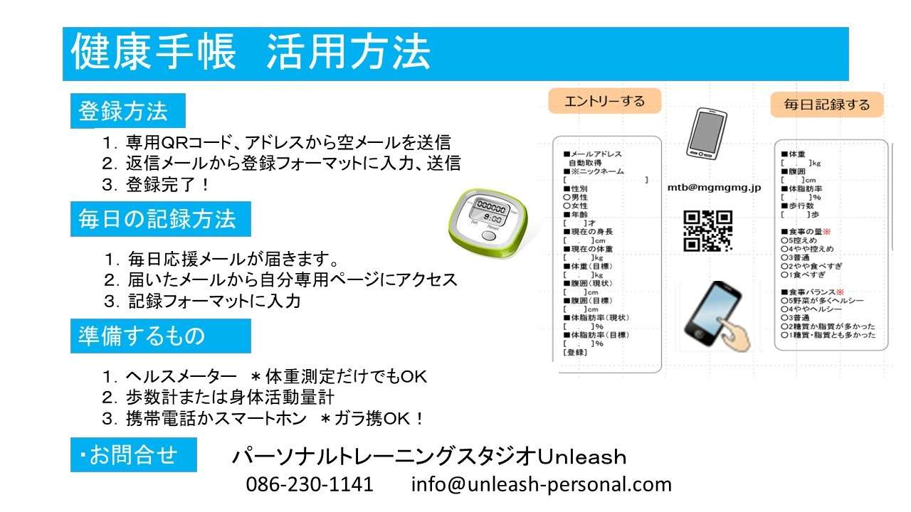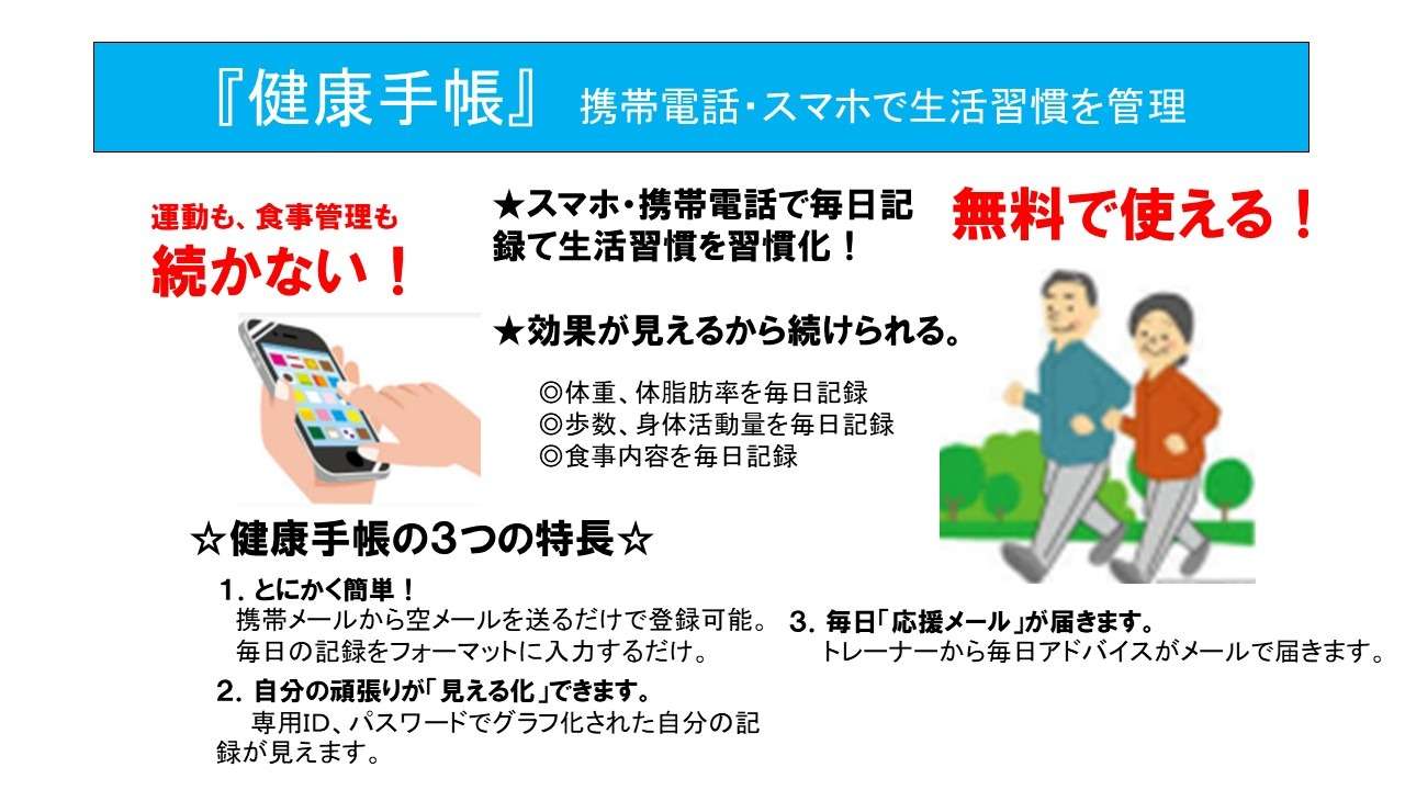 無料で使える、メールでOK、誰でも簡単に使えるツール「健康手帳」を活用してみませんか。