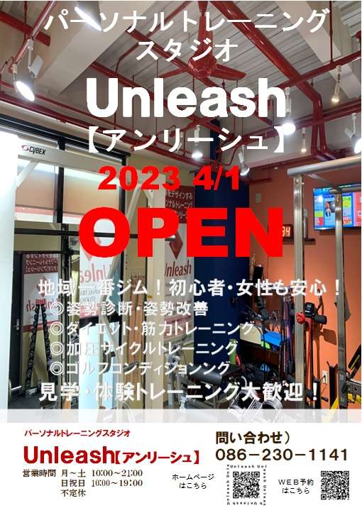 パーソナルトレーニングスタジオUnleash(アンリーシュ)は、4月1日(土)リニューアルオープンします。