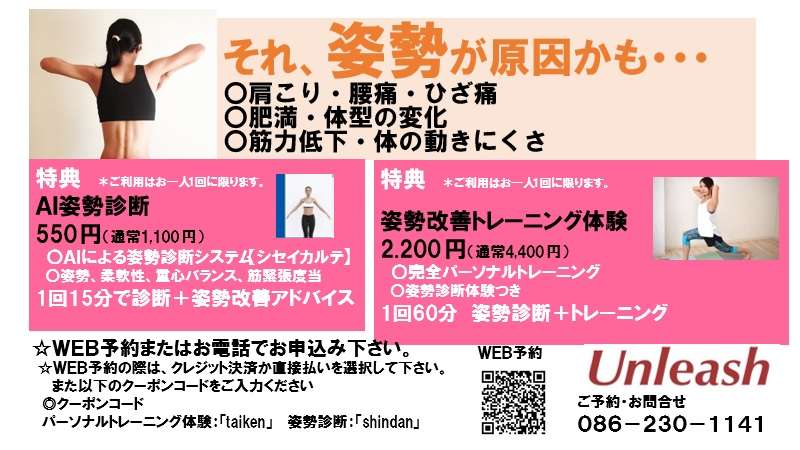 【姿勢改善キャンペーン実施中!6月1日~6月30日】 2023/06/03 【姿勢改善キャンペーン実施中!】 6月1日~6月30日 【姿勢改善キャンペーン実施中!6月1日~6月30日】 姿勢改善すると、体の悩みが改善できます 現在当ジムでは、「姿勢改善キャンペーン実施中」6月1日~6月30日 ◎AIによる姿勢診断半額 550円(通常1,100円) ◎姿勢改善トレーニング体験半額 2,200円(通常4,400円) ぜひこの機会に、姿勢改善を体験してみましょう。 またその他各種トレーニング(姿勢改善・ダイエット・ボディメイク・ゴルフコンディショニング・加圧サイクルトレーニング等)体験出来ます。 ご予約・お問合せ) 電話 086-230-1141 WEB予約 www.unleash-personal.jp